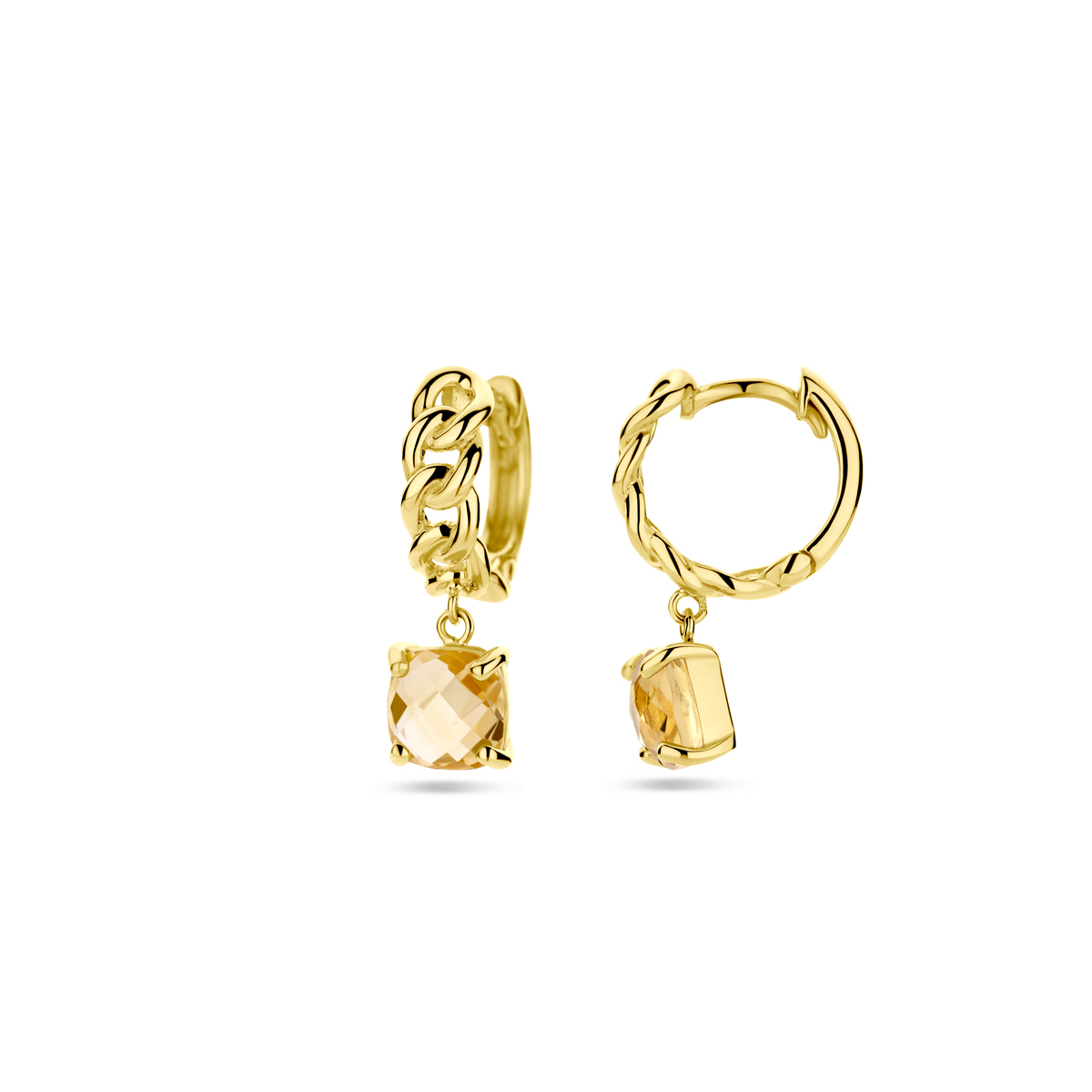 14k Geelgouden klapoorringen met schakelmotief, uitgevoerd met een citrine hanger. De klapoorring heeft een diameter van 12mm en een breedte van 4mm.