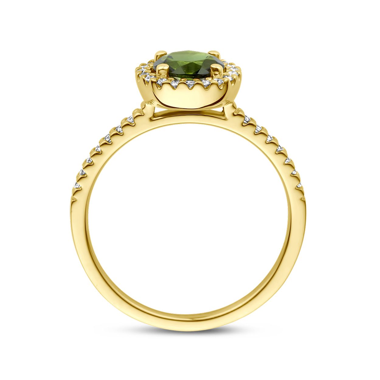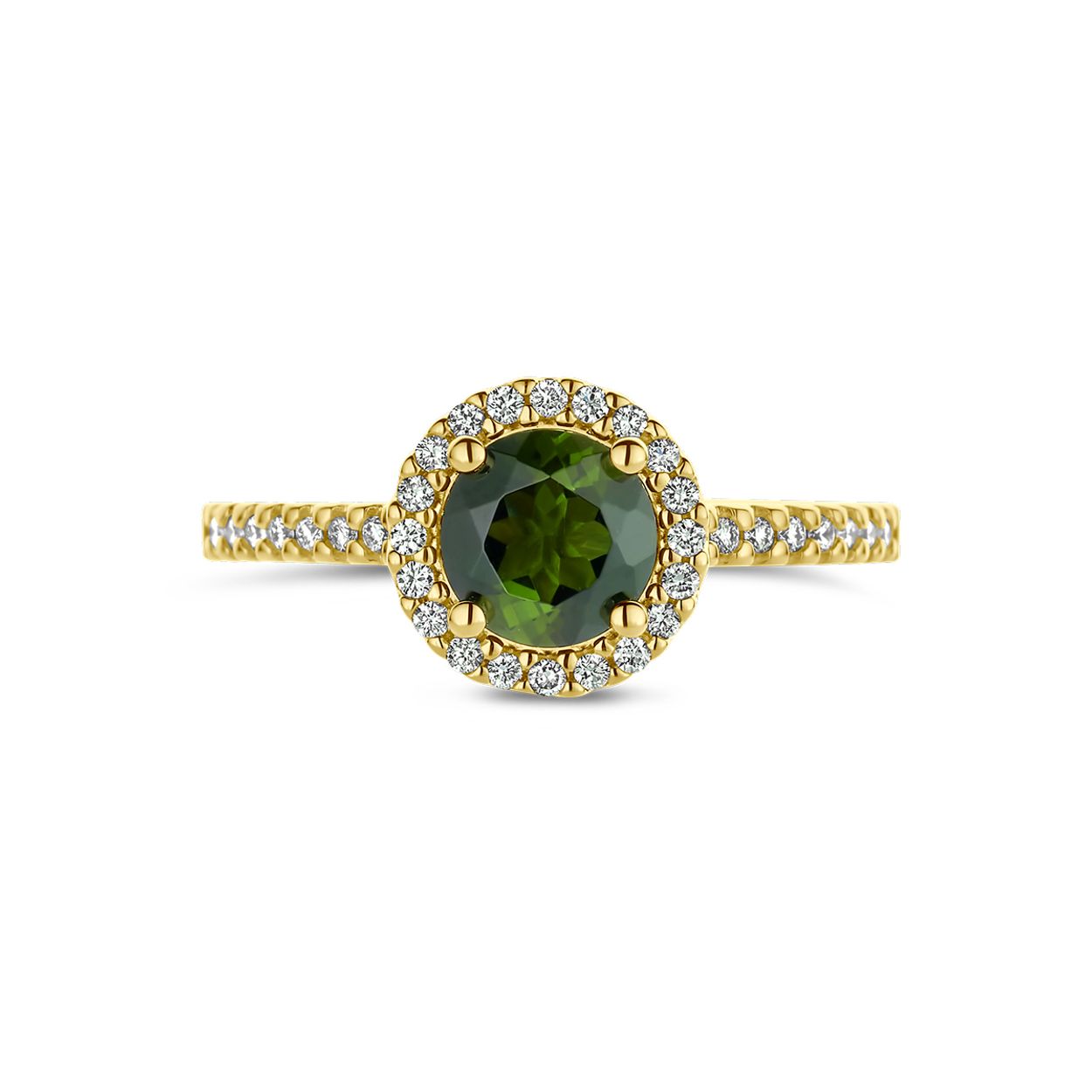 14k Geelgouden ring uitgevoerd met toermalijn en diamanten. De ring heeft een breedte van 8.5mm.