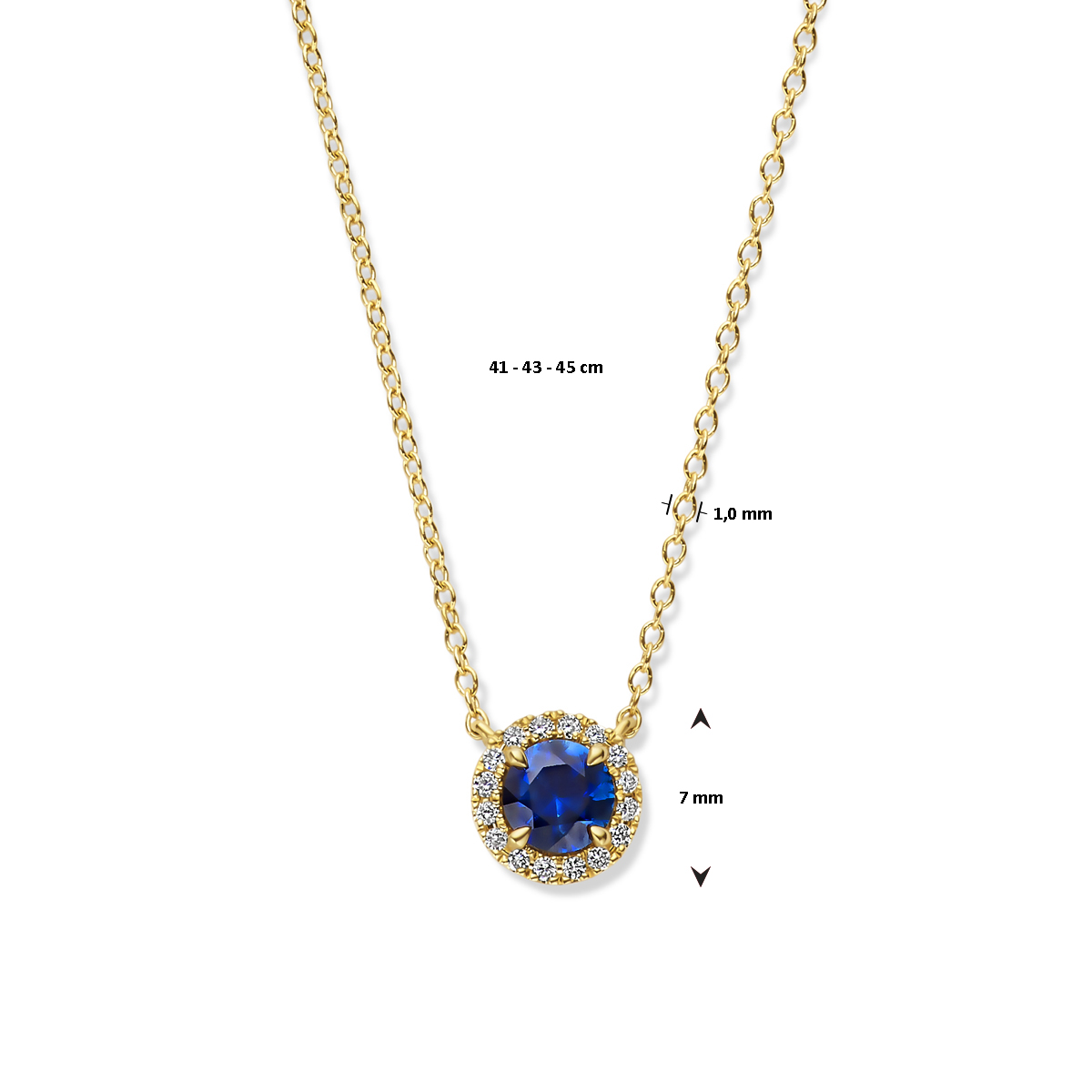 14k Geelgouden collier uitgevoerd met saffier en diamant. Het collier heeft draaglengtes van 41-43-45cm. Het totale diamantgewicht is 0.05ct.