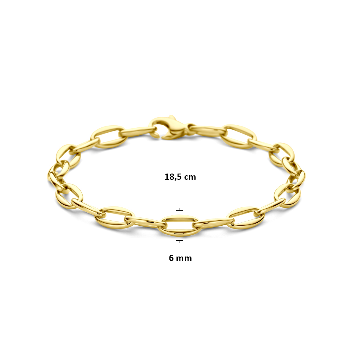 14k Geelgouden armband met een schakelbreedte van 6mm en een draaglengte van 18,5cm. Uitgevoerd met karabijnsluiting.