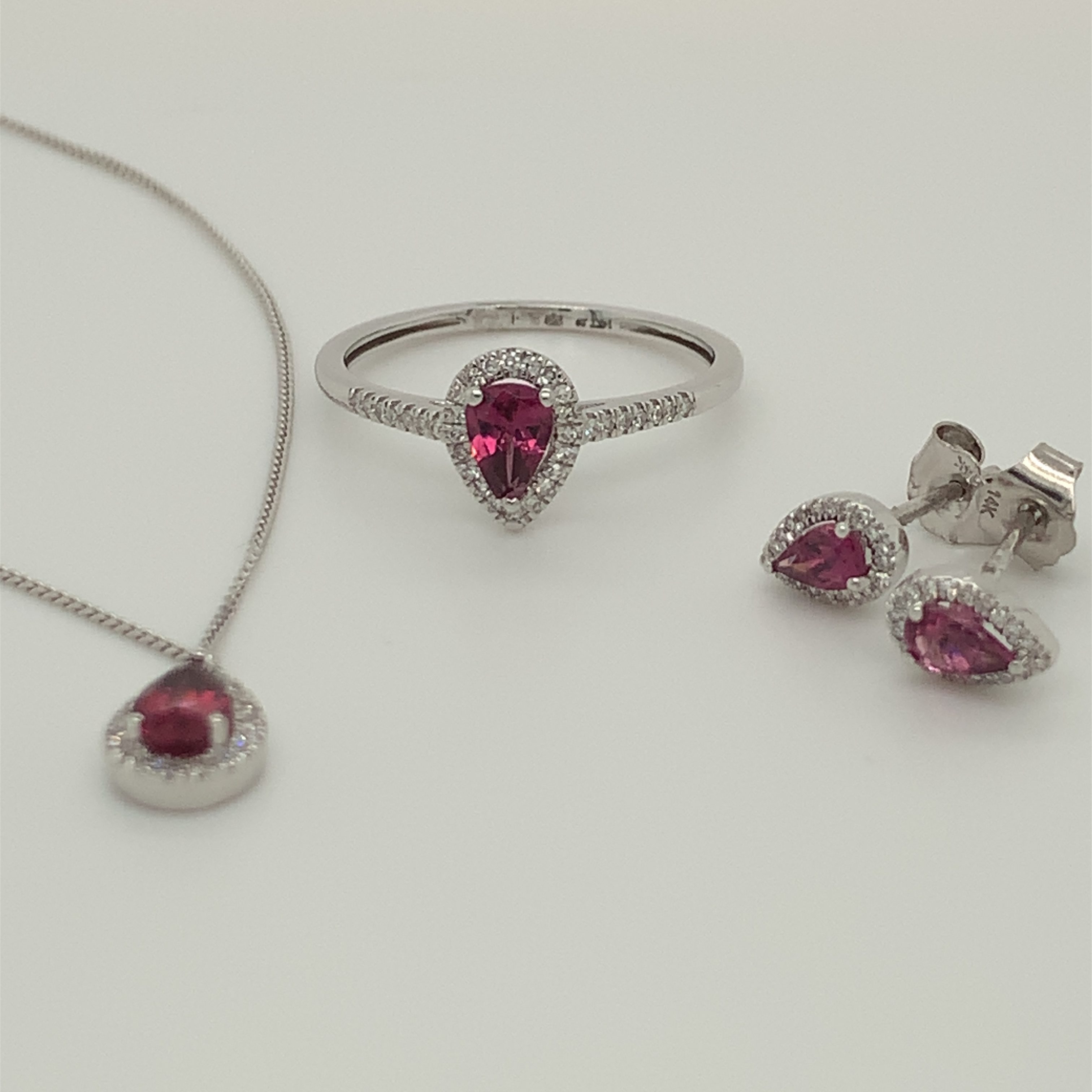 Gouden collier met rhodoniet en briljant 20-0.05/0.37crt onderdeel van een prachtige set