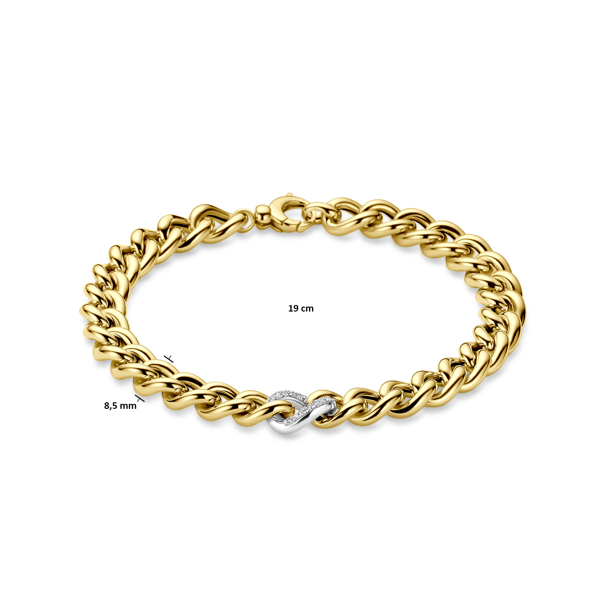 14kBicolor geel- en witgouden armband uitgevoerd met schitterende diamant. De armband heeft een schakelbreedte van 8.5mm en een draaglengte van 19cm. Het totale diamantgewicht is 0.12ct.