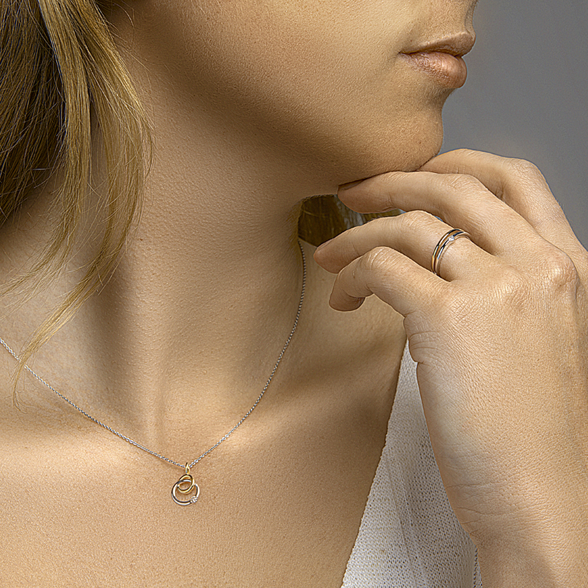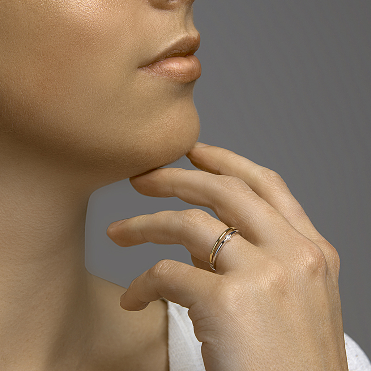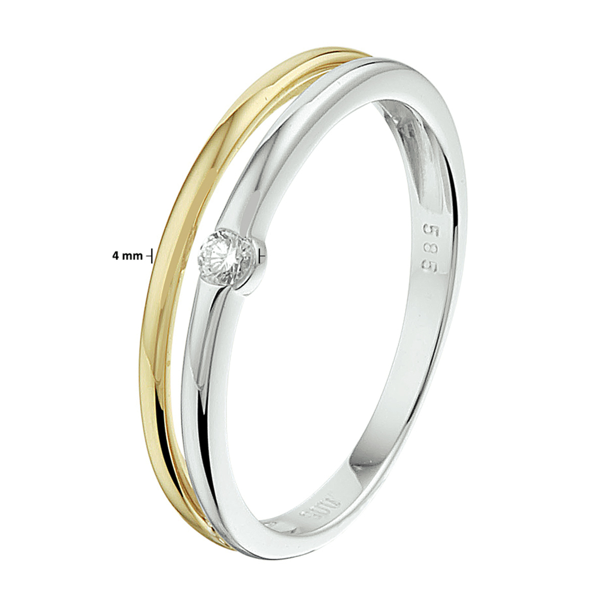 14k Bicolor geel- en witgouden ring uitgevoerd met een schitterende diamant. De ring heeft een breedte van 4mm.