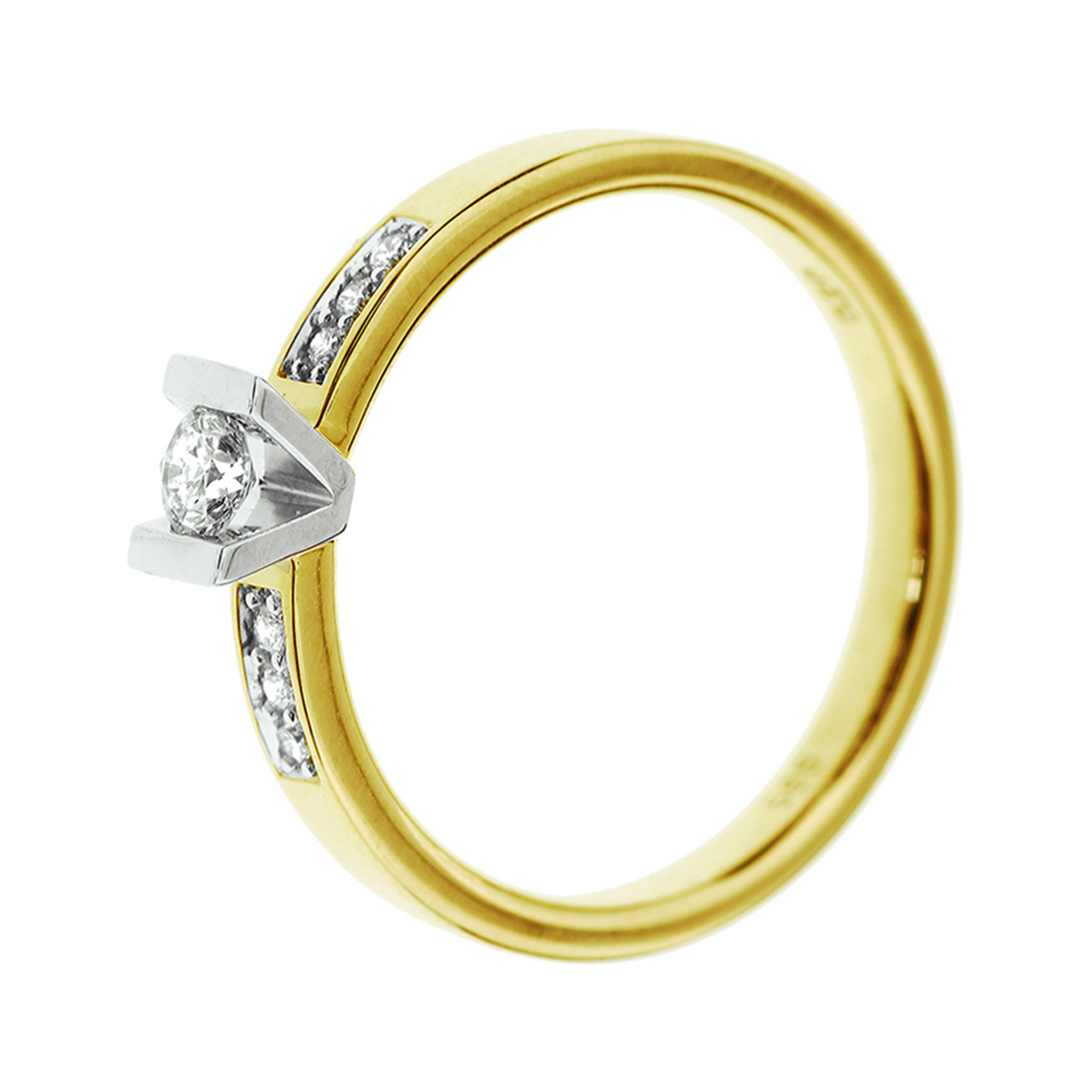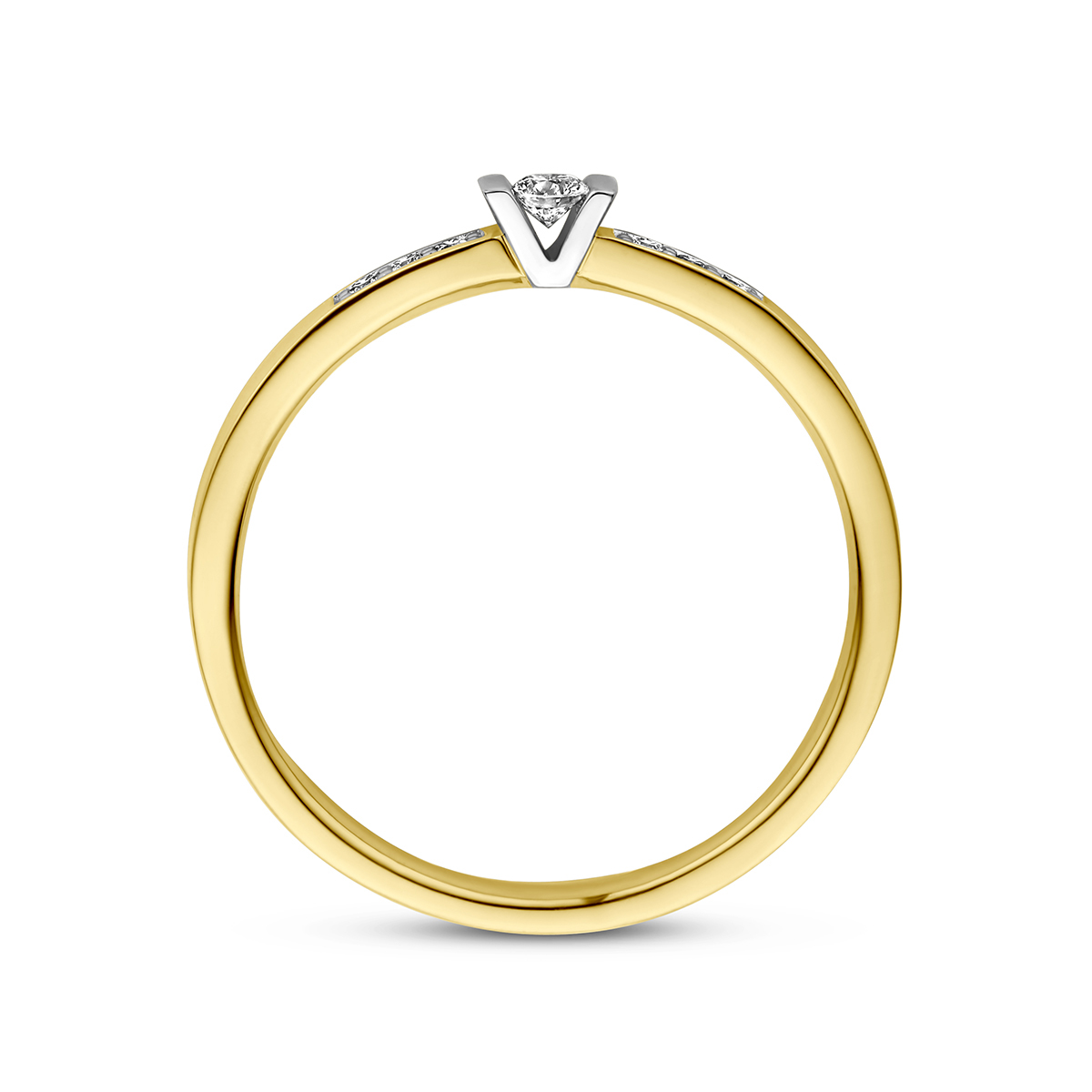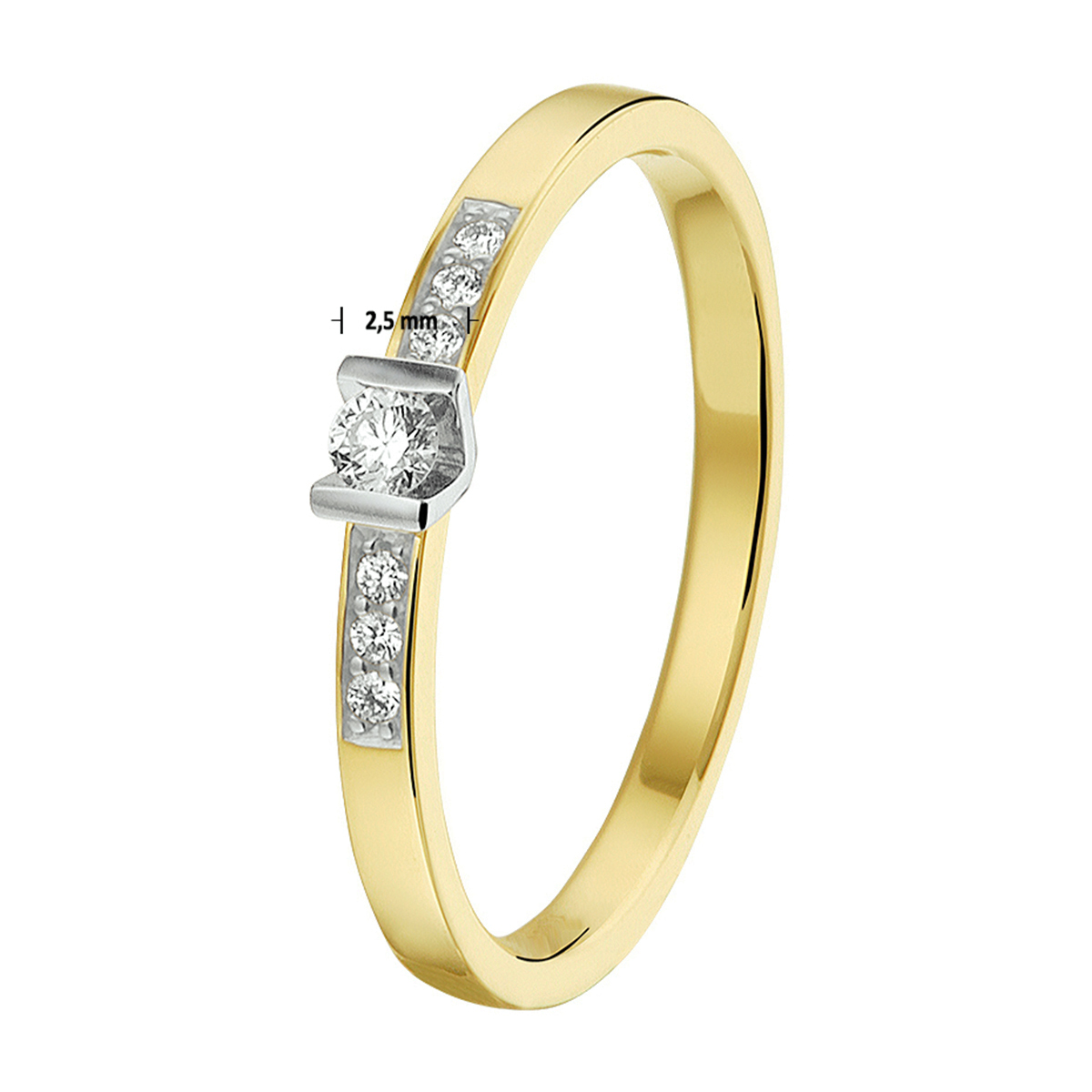 14k Bicolor geel- en witgouden ring uitgevoerd met een diamant rij. De ring heeft een breedte van 2.5mm en de solitair diamant heeft een diamantgewicht van 0.05ct.