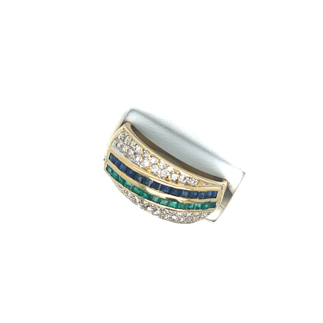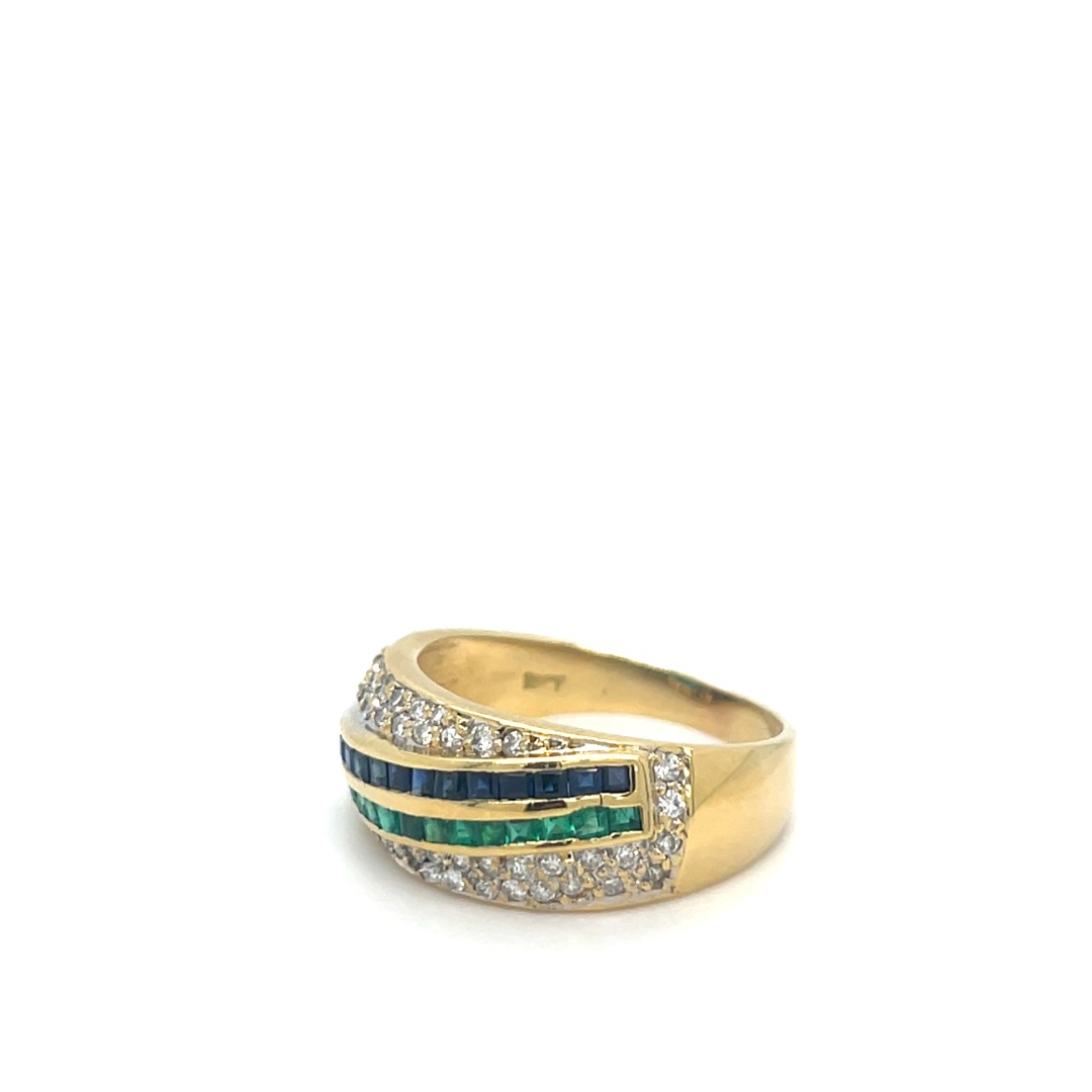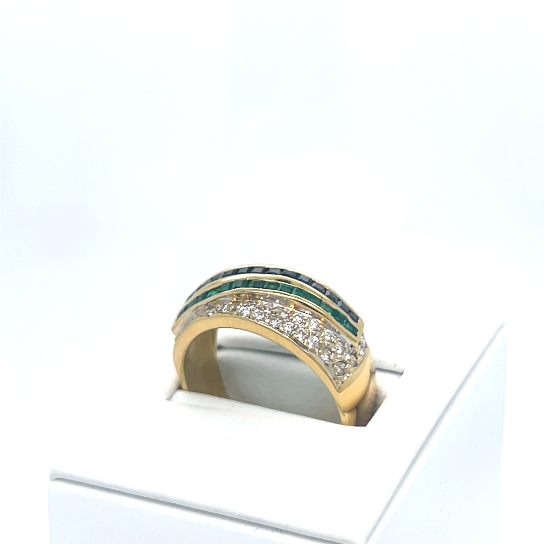 Occasion 18 karaat geel gouden ring met saffier, smaragd en briljanten
