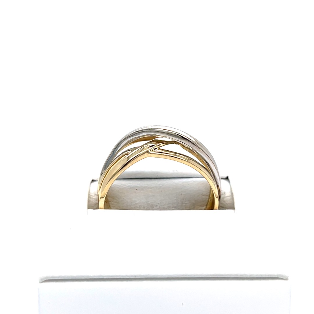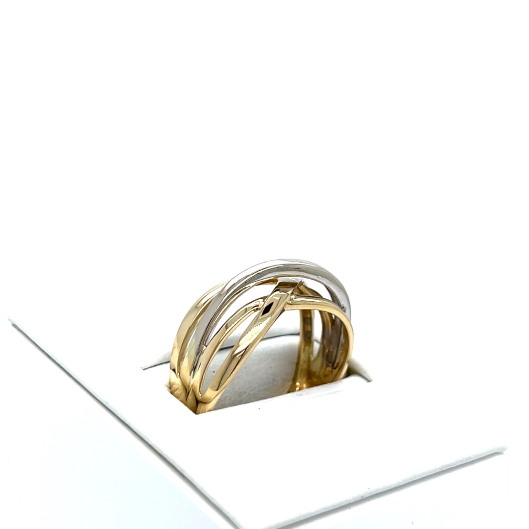 Occasion bicolor wit- en geelgoud 14 karaat crossover ring