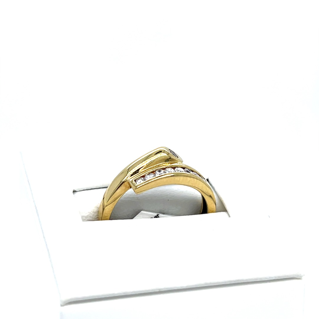 Bijzondere occasion ring 14 karaat geel goud met zirkonia stenen in een railzetting en 1 steen rond aangewreven in het uiteinde van de band van de ring.