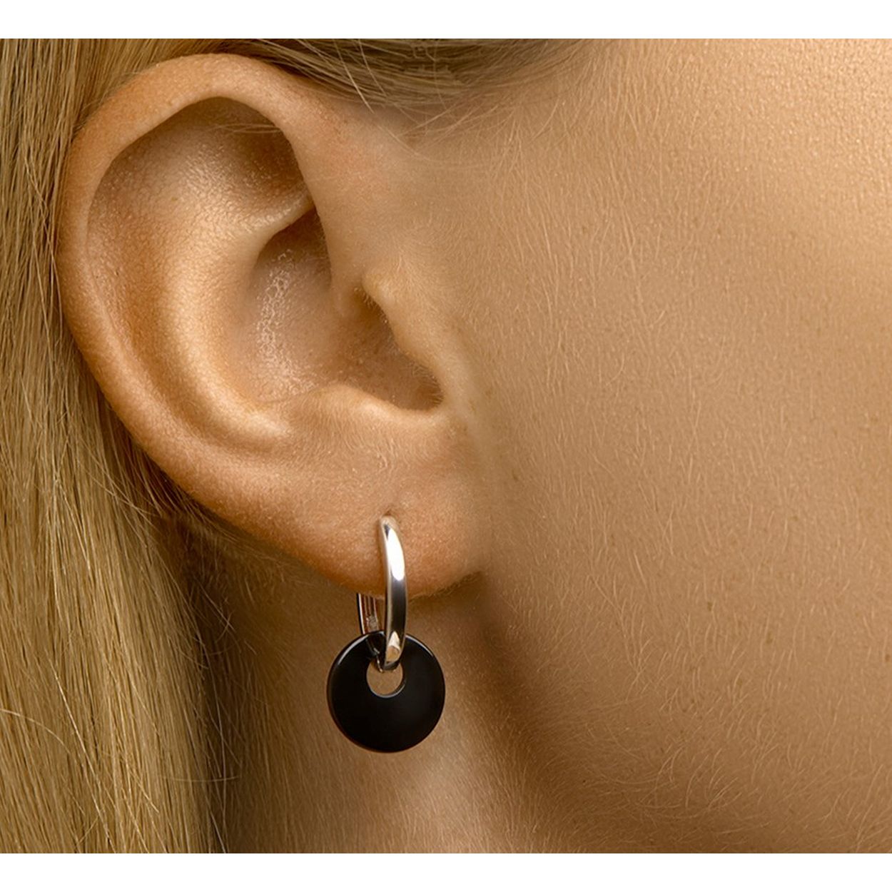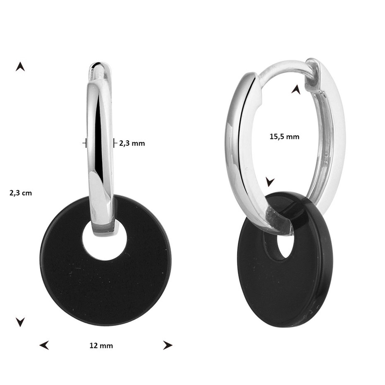 Gerhodineerd 925 zilveren oorringen uitgevoerd met een ronde onyx hanger. De oorringen hebben een totale hoogte van 2.3cm. De hanger heeft een diameter van 12mm.