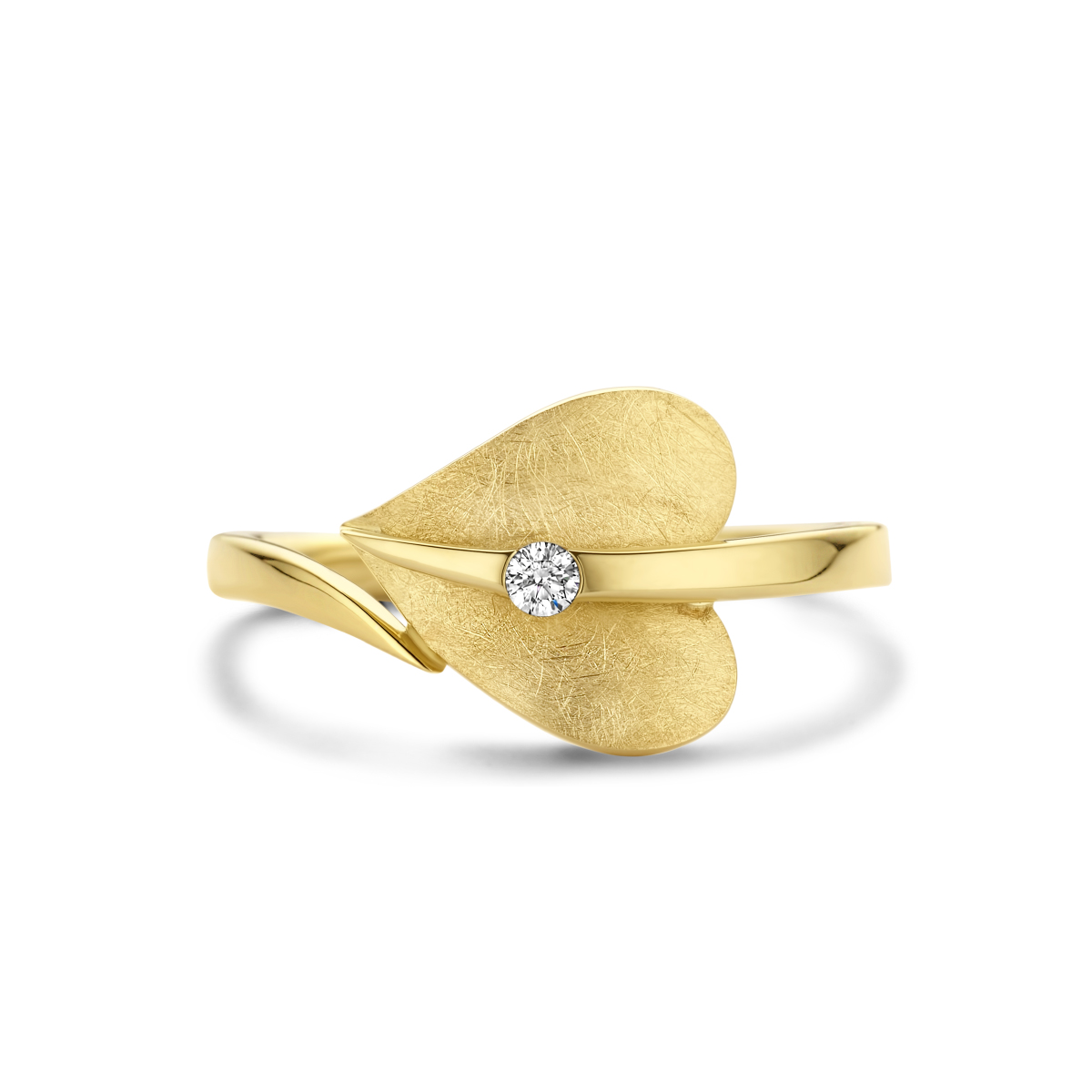 14k Geelgouden ring uitgevoerd in de vorm van een hart en een schitterende diamant daarin. De ring heeft een breedte van 10.5mm.