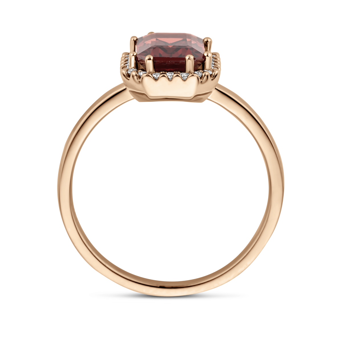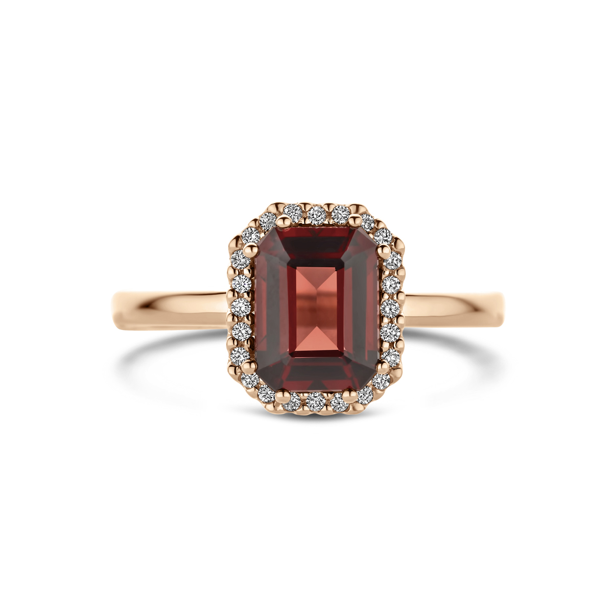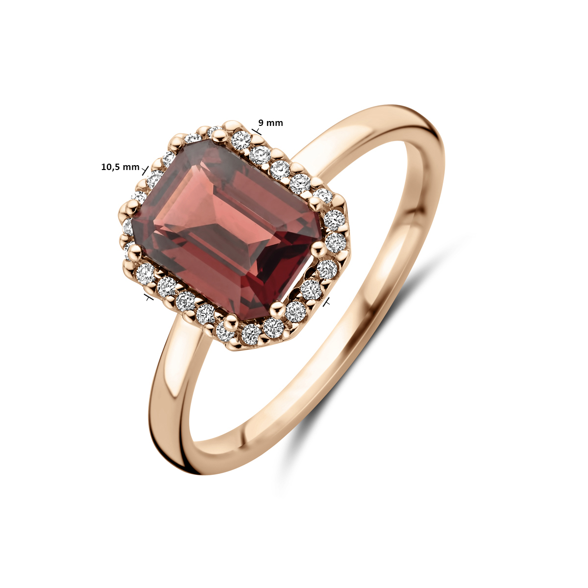 14k Rosegouden ring uitgevoerd met granaat en diamant. De ring heeft een breedte van 9mm. Het diamantgewicht is 0.10ct.