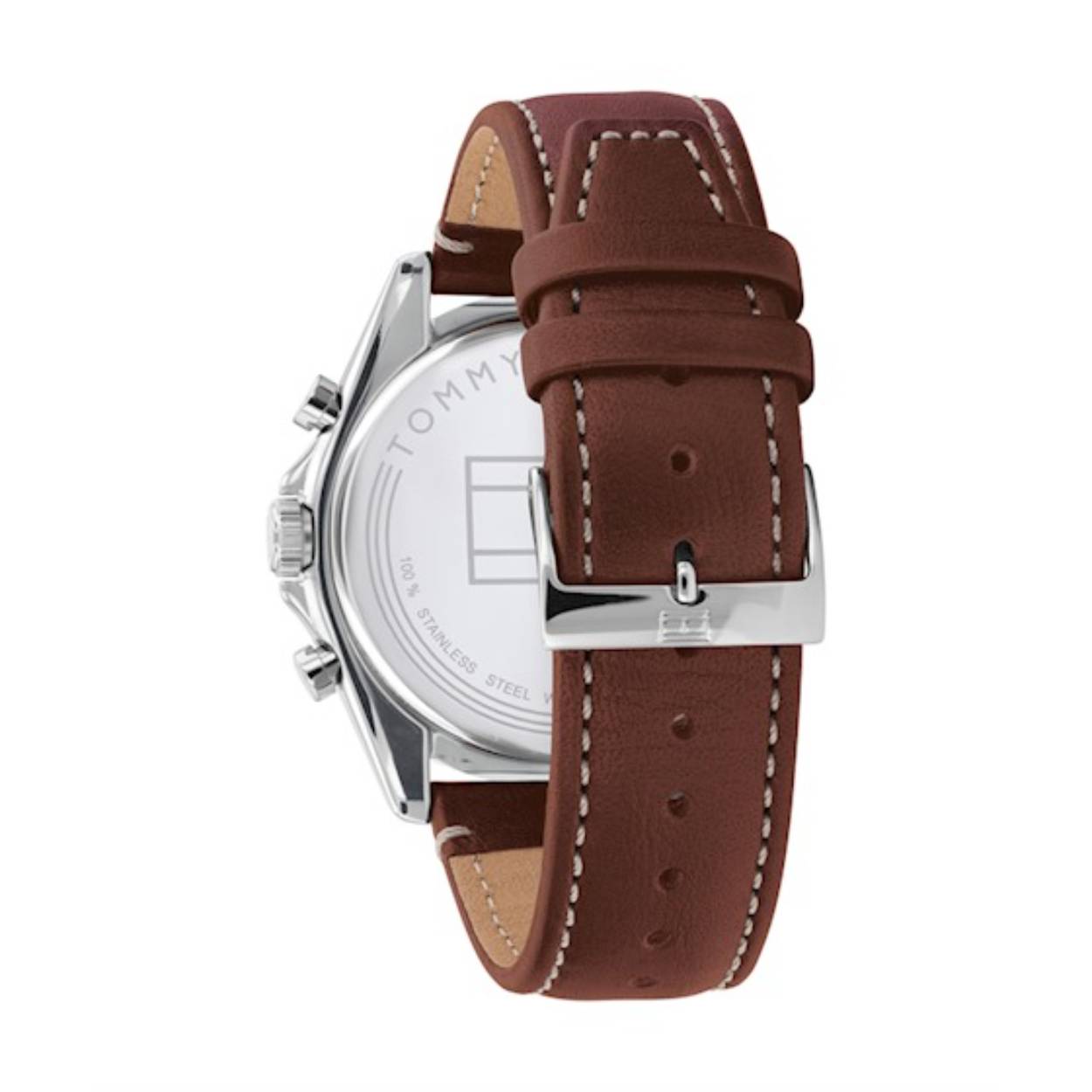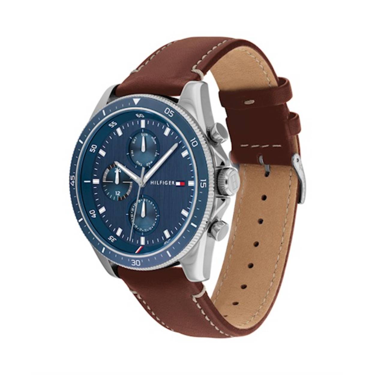 Dit Tommy Hilfiger horloge uit de "Parker' collectie heeft een bruin met wit stiksel leren band. De kast is van staal met een blauw sierrand, de wijzerplaat is ook blauw met witte wijzers. Het horloge heeft als extra functies, dag, datum en 24-uurs aanduiding
